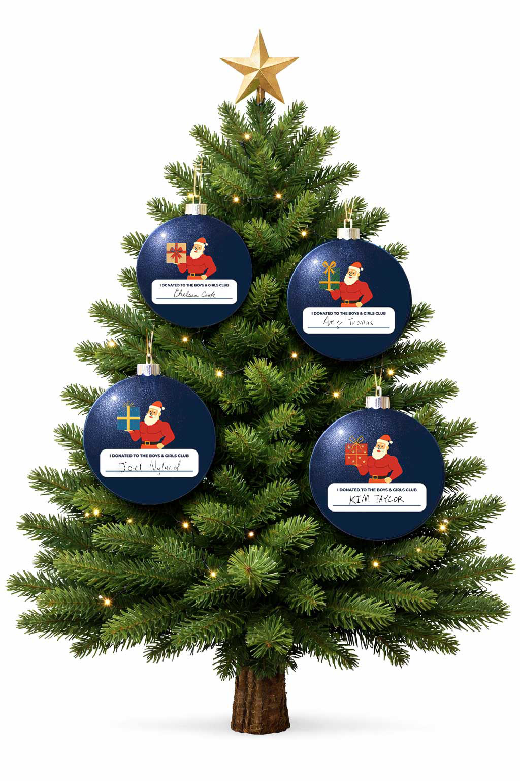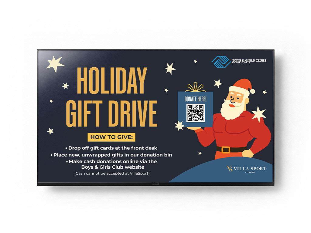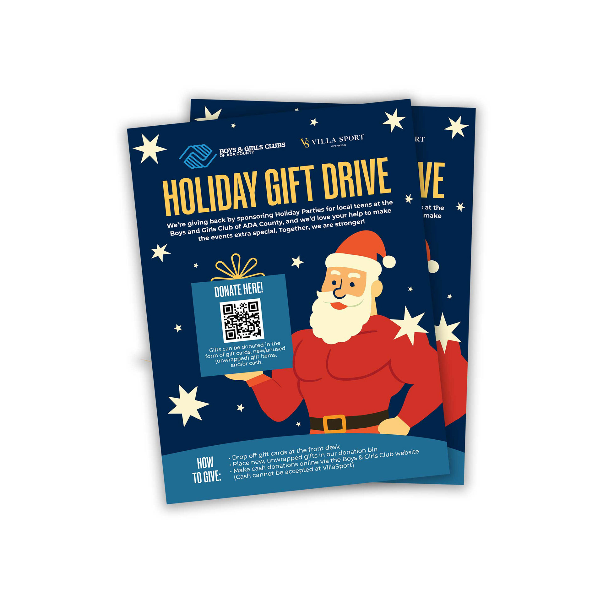 For VillaSport Fitness’s Holiday Gift Drive for the Boys & Girls Clubs of Ada County, I illustrated a buff Santa with a present, as requested by the client. Donors wrote their names on the ornaments, which were displayed on trees in the club lobby to celebrate community support and VillaSport’s sponsorship of holiday parties for local teens.